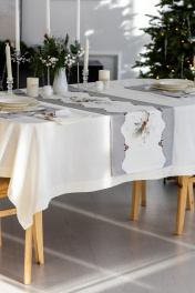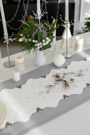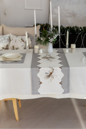 Дорожка на стол "Стоун",100% хлопок. Все коллекции «СТОУН» выполнены из ткани для столового белья плотностью 190г/кв.м и имеют специальную пропитку (влаго-, масло- и грязеотталкивающую обработку). Принт на ткани нанесен методом цифровой печати с использованием высококачественных красителей, благодаря чему изделия не линяют и не меняют свой цвет после многократных стирок. Рисунок по ткани виден только на лицевой стороне. ЭКСКЛЮЗИВНЫЙ ДИЗАЙН: гармония природной сдержанности и торжественной эстетики. Белоснежный фон с изысканным принтом в виде еловых веток и шишек создаёт атмосферу зимнего леса, наполненного светом и теплом. Идеальный выбор для тех, кто ценит стиль, уют и внимание к деталям. УХОД ЗА ИЗДЕЛИЕМ: Изделия из натуральных тканей требуют особого ухода. Стирка при температуре 30 С; деликатный отжим (чтобы уменьшить смятость изделия), гладить изделия полувлажными при максимальной температуре, не отбеливать. Если при использовании изделий было нанесено пятно, рекомендуем испачканное изделие постирать не позднее следующего дня, т.к. натуральные нити ткани быстро впитывают натуральные красители еды и напитков (чай, кофе, соусы). При стирке изделий допускается использование пятновыводящих средств для цветного белья. После стирки возможна усадка изделия на 3-5%.