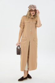Комплект 2ка, состоящий из платья и брюк. Платье длины макси из с застёжкой на пуговицы и разрезами по бокам. По переду две пары накладных кармана, горловина – стойка. Рукава платья дополнены шлейкой с застёжкой на пуговицу для сборки, на плечах стильные разрезы. Удобные повседневные брюки из лёгкой натуральной ткани. Брюки свободного прилегания по бедрам и зауженные к низу. Пояс на эластичной тесьме с кулисой и втянутым шнурком. Вход в карман фигурный, наклонный к боковому шву.