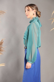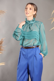 Яркий костюм, состоящий из жакета, блузки и брюк. Яркий удлинённый жакет поможет украсить любой повседневный или же праздничный образ! Классический двубортный жакет без лацканов и воротника из мягкого твида, среднего объема, полуприталенного силуэта. Застёжка на 2 пуговицы. По уровню талии - имитация карманов с клапанами. Элегантная блуза из легкой полупрозрачной ткани свободного силуэта. По переду блузки добавлен оригинальный элемент в виде складок, который служит декором, а также скрывает полупрозрачность блузы. Отделка горловины рюшами и красивым бантом по спинке делает блузку отличным вариантом для нарядного и романтичного образа! Рукава блузки объёмные, на манжетах выполнена застежка на пуговицу. Брюки умеренного объема, прямого силуэта. На передних половинках брюк заутюжены стрелки, переходящие в складки по линии талии. На задних половинках также заутюжены стрелки. В боковых швах расположены карманы. Застежка-гульфик. Пояс отрезной, притачной. В задней части пояса вставлена эластичная тесьма (резинка). На пояс настрочены шлевки. Выступающая часть пояса застегивается на петлю и крючок. Ремень не входит в комплект . Фурнитура и материалы отделки могут незначительно отличаться от тех, что на фотографии. Рост фотомодели 166 см. Размер у фотомодели – 42.