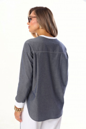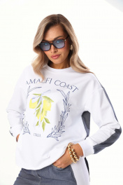 Комплект 2ка, состоящий из джемпера и брюк. Комплект выполнен из ткани двух видов. Джемпер объёмного кроя с принтом по переду. Спинка удлинённая, выполнена по принципу рубашки с кокеткой, по низу рукавов манжеты из довязов. Брюки свободного кроя от бедра. Талия брюк на резинке, по переду и сзади расположены карманы. Длина брюк 112 см , длина свитшота по спинке 75 см.