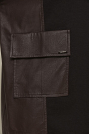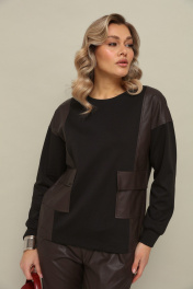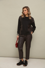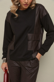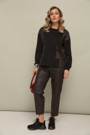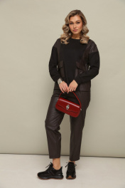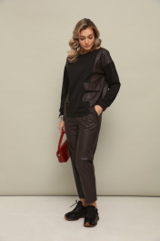 Комлект 2ка состоит из джемпера и брюк. Трикотажный джемпер свободного кроя с длинными рукавами и круглой горловиной. Передние накладные карманы и боковые вставки выполнены из экокожи. Зауженные брюки из экокожи. Пояс на эластичной тесьме и втянутым шнурком. Вход в карман фигурный, наклонный к боковому шву.