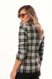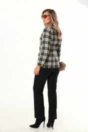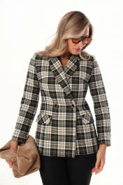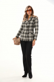 Комлект 2ка состоит из жакета и брюк. Жакет двубортный умеренного объёма из твидовой мягкой ткани. Застёжка на две пуговицы. По бокам расположены функциональные прорезные карманы с клапаном. Жакет на подкладке. Брюки среднего объема, слегка зауженного силуэта от бедер. На передних половинках с обеих сторон расположены под наклоном функциональные карманы. На задних половинках расположены вытачки. Пояс отрезной. На поясе расположены шлевки и отделочные паты. Застежка брюк – гульфик на молнии, на поясе крючок. Длина жакета по спинке 70-71 см. Длина брюк 109-110 см.