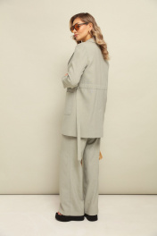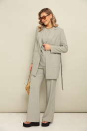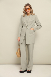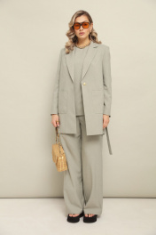 Костюм 3ка, состоящий из жакета, топ и брюк. Удлинённый однобортный жакет приталенно силуэта с застёжкой на пуговицу. По переду расположены накладные карманы. Жакет дополен поясом-кулисой, на которую можно собрать и приталить жакет по спинке.Длина по спинке 84-85 см. Топ с короткими рукавами и ассиметричным низом. Сбоку низ удлинен на завязки.Длина 68 см. Брюки прямого кроя свободного объёма от бедра, пояс на резке.По бокам карманы с наклонным входом. Длина по боковому 110-114 см.