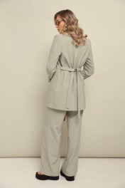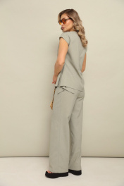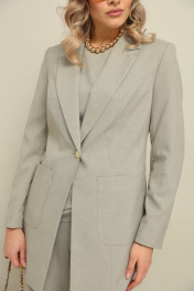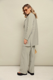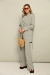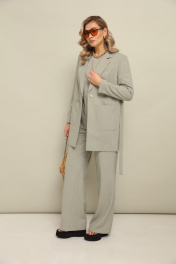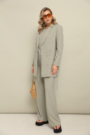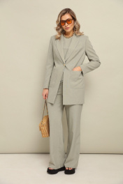 Костюм 3ка, состоящий из жакета, топ и брюк. Удлинённый однобортный жакет приталенно силуэта с застёжкой на пуговицу. По переду расположены накладные карманы. Жакет дополен поясом-кулисой, на которую можно собрать и приталить жакет по спинке.Длина по спинке 84-85 см. Топ с короткими рукавами и ассиметричным низом. Сбоку низ удлинен на завязки.Длина 68 см. Брюки прямого кроя свободного объёма от бедра, пояс на резке.По бокам карманы с наклонным входом. Длина по боковому 110-114 см.