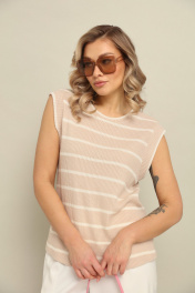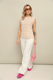 Комплект 2ка, состоящий из жилета и брюк. Жилет из трикотажного плотна без рукавов свободного силуэта прямого кроя с круглой горловиной. Брюки широкого объема, прямого силуэта. На передних половинках брюк заутюжены стрелки, переходящие в складки по линии талии. На задних половинках также заутюжены стрелки. В боковых швах расположены карманы. Застежка-гульфик. Пояс отрезной, притачной. В задней части пояса вставлена эластичная тесьма (резинка). На пояс настрочены шлевки. Выступающая часть пояса застегивается на петлю и крючок.