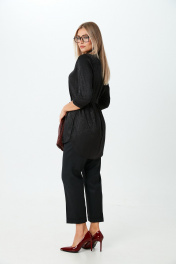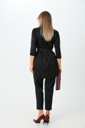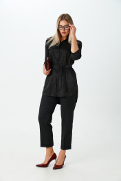 Комплект 2ка, состоящий из блузки и брюк. Удлинённая блузка с застёжкой на пуговицы,воротник рубашечного типа,рукава 3/4. В комплекте пояс из основной ткани. Зауженные брюки с подворотами по низу. Пояс на эластичной тесьме с кулисой и втянутым шнурком. Вход в карман фигурный, наклонный к боковому шву.
