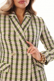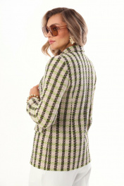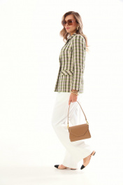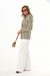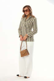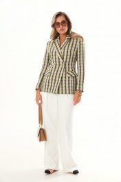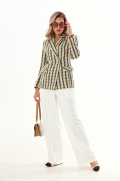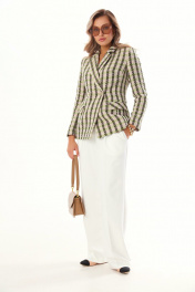 Комлект 2ка состоит из жакета и брюк. Жакет двубортный умеренного объёма из тёплой мягкой ткани. Застёжка на две пуговицы. По бокам расположены функциональные прорезные карманы с клапаном. Жакет на подкладке. Брюки широкого объема, прямого силуэта. На передних половинках брюк заутюжены стрелки, переходящие в складки по линии талии. На задних половинках также заутюжены стрелки. В боковых швах расположены карманы. Застежка-гульфик. Пояс отрезной, притачной. В задней части пояса вставлена эластичная тесьма (резинка). На пояс настрочены шлевки. Выступающая часть пояса застегивается на петлю и крючок. Длина жакета по спинке 70-71 см. Длина брюк 110-114 см