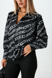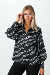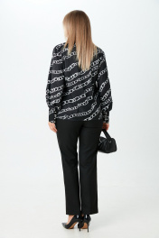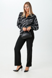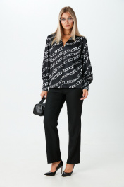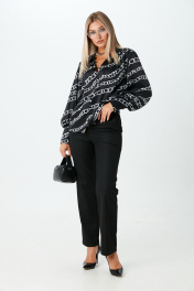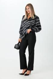 Комплект 2ка, состоящий из блузки и брюк. Блуза из тонкой ткани с атласным эффектом, свободного силуэта с V-образным вырезом. Это довольно глубокий вырез, который прекрасно подчёркивает декольте и линию шеи. Застежка на навесные петли и пуговицы. Рукава длинные объёмные втачные заканчиваются широкой манжетой с застёжкой на навесные петли с пуговицами. Брюки малого объема, прямого силуэта. На передних половинках с обеих сторон расположены под наклоном нефункциональные прорезные карманы в рамку. На задних половинках расположены вытачки. Пояс отрезной. На поясе расположены шлевки. Застежка брюк – гульфик на молнии, на поясе крючок. Длина блузки 67 см, длина брюк 110-112 см .