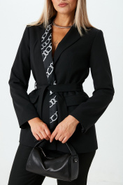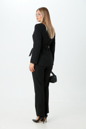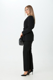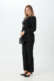 Костюм 2ка, состоящий из жакета и брюк. Жакет однобортный малого объёма приталенного силуэта с застёжкой на петлю и пуговицу. По бокам расположены функциональные прорезные карманы с клапаном. Жакет на подкладке. В комлекте к жакету идёт пояс. В качестве декора на воротнике жакета выполнена вставка из атласной ткани с принтом. Брюки умеренного объема, прямого силуэта. На передних половинках брюк заутюжены стрелки, переходящие в складки по линии талии. На задних половинках также заутюжены стрелки. По бокам расположены функциональные карманы. Застежка-гульфик. Пояс отрезной, притачной. На пояс настрочены шлевки. Пояс застегивается на петлю и крючок.