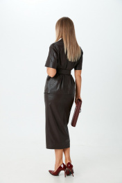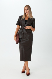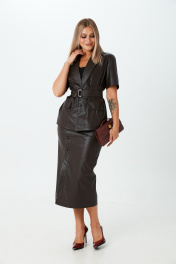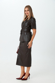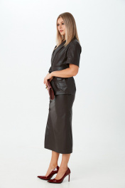 Комплект 2ка, состоящий из жакета и юбки. Жакет из экокожи на вискозе с короткими рукавами, без подкладки. Застёжка на пуговицы по центру. По переду имитация карманов с клапанами. В комплекте идёт пояс с пряжкой. Юбка-карандаш из экокожи длины ниже колена, на подкладке. По переду юбка расположена застёжка на пуговицы. По бокам карманы.