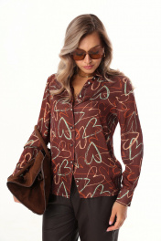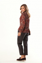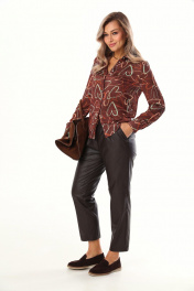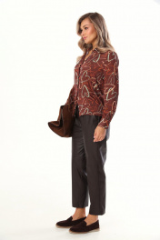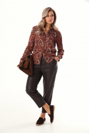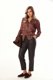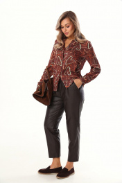 Комплект 2ка, состоящий из блузки и брюк. Блузка прямого силуэта с оригинальным принтом из лёгкой ткани с атласным мягким блеском. Воротник рубашечного типа, застежка на прорезные петли и пуговицы. В нижней части рукава заложены складки, манжета на двух пуговицах. Зауженные брюки из экокожи. Пояс на эластичной тесьме и втянутым шнурком. Вход в карман фигурный, наклонный к боковому шву.