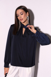 Комплект 2ка, состоящий из блузки и брюк. Блуза из плотной струящейся ткани с атласным эффектом объёмного кроя с воротником-стойкой и сборкой по горловине. Манжеты с застёжкой на две пуговицы, легкая сборка по низу рукавов. Брюки широкого объема, прямого силуэта. На передних половинках брюк заутюжены стрелки, переходящие в складки по линии талии. На задних половинках также заутюжены стрелки. В боковых швах расположены карманы. Застежка-гульфик. Пояс отрезной, притачной. В задней части пояса вставлена эластичная тесьма (резинка). На пояс настрочены шлевки. Выступающая часть пояса застегивается на петлю и крючок. Рост фотомодели 175 см. Размер у фотомодели – 44.
