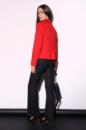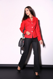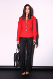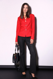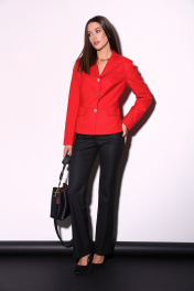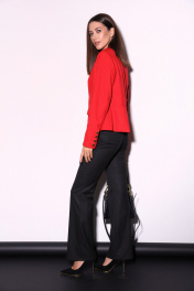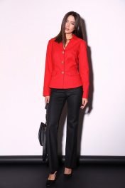 Комплект 2ка, состоящий из жакет и брюк. Укороченный однобортный жакет приталенного силуэта с отложным воротником и лацканом. Жакет с отрезной линией талии и слегка расширенной баской. Застёжка на петли и пуговицы. По переду имитация карманов с клапанами. Рукава с имитацией шлицы с петлями и пуговицами. Классические брюки из плотной ткани. Пояс на высокой посадке. На передних половинках расположены под наклоном нефункциональные прорезные карманы в рамку. На задних половинках расположены вытачки. Пояс со шлевками. Застежка брюк – гульфик на молнии, по поясу крючок и петля.
