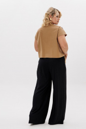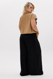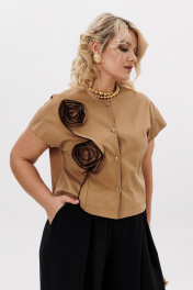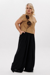 Комплект 2ка, состоящий из блузки и брюк. Укороченная блузка с короткими рукавами и застёжкой на пуговицы. Вырез горловины круглый. По переду блузки выполнен декор из основной ткани в виде цветов. Брюки широкого объема. По центру переда заложены две широкие встречные складки на каждой половинке. В боковых швах расположены карманы с наклонным входом. Талия на резинке.