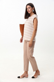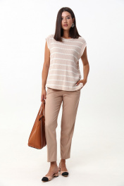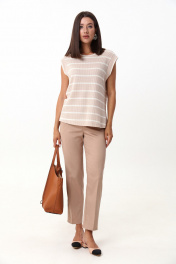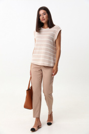 Комплект 2ка, состоящий из жилета и брюк. Жилет из трикотажного плотна без рукавов свободного силуэта прямого кроя с круглой горловиной. Брюки классического силуэта с комфортной средней посадкой на притачном поясе со шлёвками. По переду брюк застежка-молния. Спереди косые боковые карманы, сзади имитация прорезных карманов с листочкой. Лаконичность форм подчеркивается строгой посадкой по линии талии, а минимализм в деталях – прорезными карманами и заутюженным кантом.