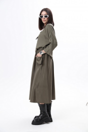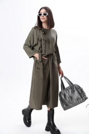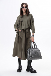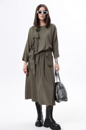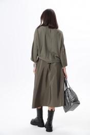 Комплект 2ка, состоящий из джемпера и юбки. Джемпер из неэластичного вискозного полотна, свободного объема с укороченными рукавами и оригинальным декором из ткани-компаньона по переду в виде настрочных лент и цветов. Юбка - силуэта «трапеция», широкого объёма, длина миди, талия на резинке. Спереди юбка дополнена ункциональными карманами, входящими в талиевый шов и свободно висящие по низу. СОВЕТ ОТ СТИЛИСТА: вещи комплекта можно легко разделить и укомплектовать джемпер прямыми широкими джинсами в синем цвете, а под юбку надеть водолазку и ремень на талию или футболку в принтом в цвете хаки. Из обуви , наш комплект отлично сочетается с грубыми ботинками, как на фотомодели или с сапогами с широким голенищем на каблуке. Рост фотомодели 175 см. Размер у фотомодели – 44 .