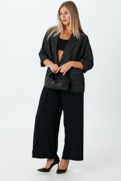 Комплект 2ка, состоящий из жакета и брюк. Жакет большого объёма с двубортной застежкой по одной стороне на петли и пуговицы. Рукава 3/4 с манжетами. Жакет без подкладки. По переду расположены накладные карманы. Длина жакета по спинке 70-72 см. Широкие брюки-кюлоты свободного оригинального кроя с застёжкой на запах на петли и пуговицы. Без карманов.