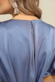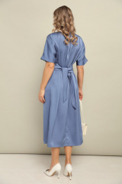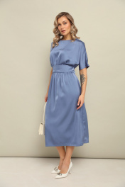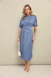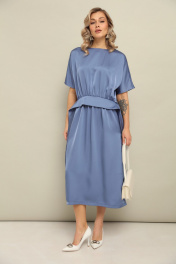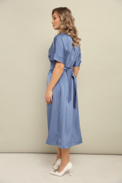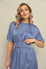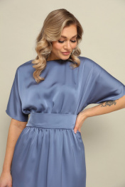 Платье длины миди со свободной юбкой и пришивным по переду поясом. Рукав цельнокроеный. По спинке встречные складки и застёжка по линии горловины на пуговицу. Длина по спинке 125 см.