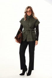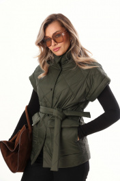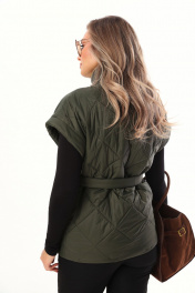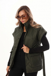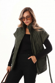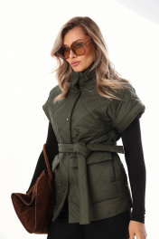 Жилет свободного силуэта из объемной стеганой ткани. Жилет на подкладке. Спущенная линия плеча, застёжка на кнопки. По переду широкие накладные карманы с клапаном с боковым входом для удобства. В комплекте идёт пояс из основной ткани. Длина по спинке 71-73 см.
