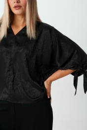 Укороченная блузка свободного силуэта с V- образной горловиной. Рукава цельнокроенные длинной ¾ . По низу рукавов оригинальные завязки. Низ блузки прямой.