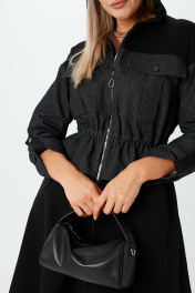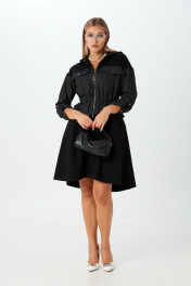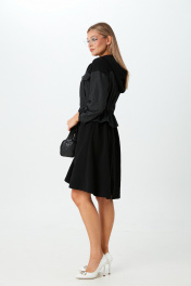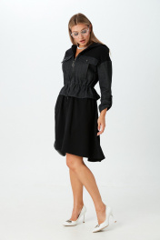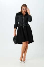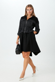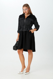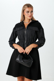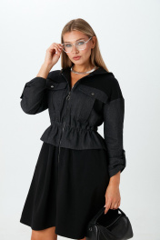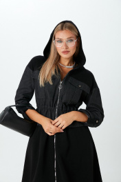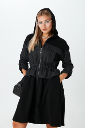 Платье в спортивном стиле длины до колена с застёжкой на молнию. Верх платья как иммитация куртки с капюшоном. По переду выше груди расположены клапаны. По талии вставлена резинка. Рукава дополнены патой с застёжкой на пуговицу для сборки. По бокам карманы. Длина по спинке 107-112 см