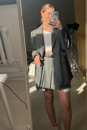 Комплект 3-ка, состоящий из жакета, юбки и футболки. Однобортный объёмный жакет на подкладке прямого силуэта из костюмной полушерстяной ткани высокого качества. По переду изделия прорезные карманы с клапанами. Рукава втачные двухшовные. Спинка со средним швом и завышенной шлицей. В качестве декора по верхней части оката рукавов пришиты цепочки, а по бокам выполнена имитация ремней из основной ткани с люверсами и пряжкой. Юбка в складку длиной до колена. Застёжка на молнию в боковом шве. Особенность модели - имитация выглядывающих карманов по низу юбки. Классическая белая футболка с короткими рукавами прямого силуэта, круглый вырез горловины. Фурнитура и материалы отделки могут незначительно отличаться от тех, что на фотографии Рост фотомодели 169 см. Размер у фотомодели – 44.