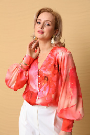 Изящная блуза из тонкой и нежной ткани с эффектом "свечения изнутри" и сатиновым блеском. Блуза свободного силуэта с V-образным вырезом. Это довольно глубокий вырез, который прекрасно подчёркивает декольте и линию шеи. Застежка на навесные петли и пуговицы. Рукава длинные объёмные втачные заканчиваются широкой манжетой с застёжкой на навесные петли с пуговицами. Рост модели 170, размер 48.