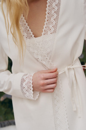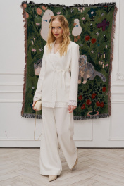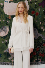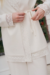 Комплект состоит из жакета и брюк. Жакет свободного кроя, прямого силуэта на хлопковой подкладке. Рукав втачной длинный, по низу рукава кружевная тесьма из хлопка. Y-образный вырез горловины. Застежка на потайную петлю и пуговицу, а также на завязке по линии талии. По борту и низу изделия – тесьма. По спинке кокетка, от кокетки по центру вшита тесьма. Брюки свободного кроя на притачном поясе на резинке, в боковых швах карманы. Жакет: Длина по спинке от высшей точки горловины: 78 см; Длина рукава от горловины: 65 см; ОГ: 104-108-112-116-120 см (размер 42-44-46-48-50); Брюки: ОТ: 62-66-70-74-78 см (размер 42-44-46-48-50), в растяжении 80-84-88-92-96 см (размер 42-44-46-48-50) ОБ: 100-104-108-112-116 см (размер 42-44-46-48-50) Длина: 113 см