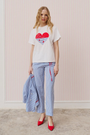 Костюм состоит из жакета и брюк. Жакет прямого силуэта, линия плеча спущена, рукав короткий, по низу рукава отложные манжеты с окантовкой в красном цвете. Округлый вырез горловины. Застежка глубокая, двубортная на петлю и пуговицу, низ борта округлой формы. Брюки на притачном поясе, по переду складки, застежка на молнию. В боковых швах прорезные карманы, по низу брюк отложная манжета. Жакет: Длина по спинке от высшей точки горловины: 52 см; Длина рукава от горловины: 29 см; ОГ: 104-108-112-116-120 см (размер 42-44-46-48-50); Брюки: ОТ: 74-78-82-86-90 см (размер 42-44-46-48-50) ОБ: 100-104-108-112-116 см (размер 42-44-46-48-50) Длина: 99 см