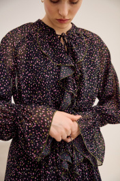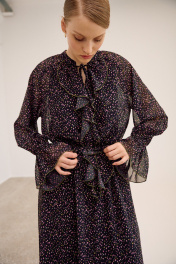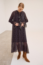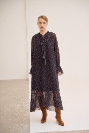 Платье свободного кроя, выполнено из шифона, дизайн мелкий цветочек. Рукав длинный реглан, по низу рукава резинка. Глубокий V-образный вырез горловины, в который вставлена рюша, по горловине стойка на завязку, по середине выреза застежка на навесной потайной крючок. По линии талии по переду и спинке кулиса на завязку, по низу платья притачной волан. В комплект входит платье-комбинация из трикотажной подкладки на бретелях. Платье: Длина по спинке от высшей точки горловины: 138 см Длина рукава от горловины: 71 см ОГ: 118-122-126-130-134 см (размер 44-46-48-50-52) ОТ: 124-128-132-136-140 см (размер 44-46-48-50-52) Платье-комбинация: Длина изделия: 96 см ОГ: 94-98-102-106-110 см (размер 44-46-48-50-52) ОТ: 98-102-106-110-114 см (размер 44-46-48-50-52) ОБ: 108-112-116-120-124 см (размер 44-46-48-50-52)
