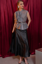 Блуза прямого силуэта, по горловине воротник-стойка. Центральная застежка на петли и пуговицы. На левой стороне блузы настрочные воланы. Длина по спинке от высшей точки горловины: 60 см Длина рукава: 62 см ОГ: 104-108-112-116 см (размер 42-44-46-48)