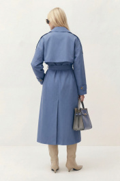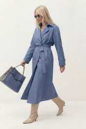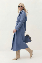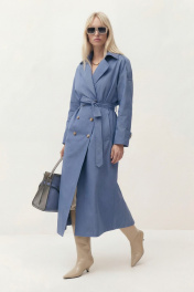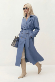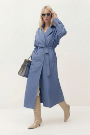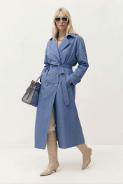 Тренч свободного кроя на подкладке. Линия плеча спущена. Рукав длинный, по рукаву средний шов, по низу рукава пата на пуговицу. На плечевом шве пата-погон. Воротник пиджачного кроя, застежка двубортная, по бокам прорезные карманы-листочка. По спинке средний шов, переходящий в шлицу, и отлетная кокетка. В комплект входит съемный пояс. Длина по спинке от высшей точки горловины: 134 см Длина рукава от горловины: 76 см ОГ: 126-130-134-138-142 см (размер 42-44-46-48-50)