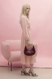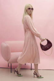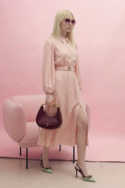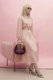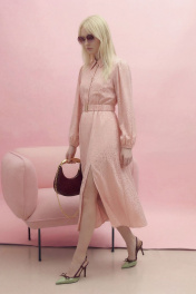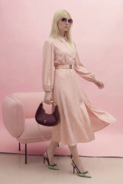 Платье миди-длины отрезное по линии талии. По линии груди накладные карманы. Рукав втачной длиной ¾, верхняя часть рукава на сборке, низ рукава присобран резинкой. Воротник рубашечного типа. Центральная застежка до линии талии на металлические кнопки. В боковых швах карманы. Сбоку платья выполнен разрез. Линия талии может регулироваться съемным поясом на резинке с металлической пряжкой. Длина по спинке от высшей точки горловины: 126 см Длина рукава: 55 см ОГ: 100-104-108 см (размер 44-46-48) ОТ: 96-100-104 см (размер 44-46-48) ОБ: 130-134-138-142 см (размер 44-46-48)