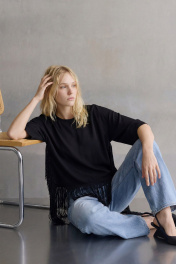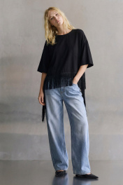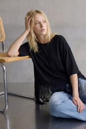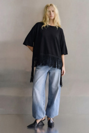 Блуза свободного кроя выполнена из трикотажного полотна, линия плеча спущена, рукав кроткий, округлый вырез горловины обработан бейкой, по переду к низу пришита бахрома с отлетными концами. Блуза: Длина по спинке от высшей точки горловины: 62 см; Длина рукава от горловины: 38 см ОГ: 111-115-119-123-127 см (размер 42-44-46-48-50);