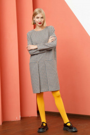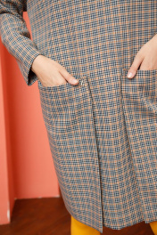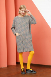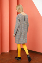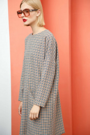 Платье свободного кроя оверсайз выполнено из костюмной ткани в мелкую клетку, на подкладке, рукав спущенный длинный. По переду округлый вырез горловины, нагрудные вытачки, накладные отлетные карманы. По спинке средний шов, переходящий в застёжку на металлической молнию. Платье очень комфортное, а быть в комфорте значит быть в гармонии с собой внутри и снаружи. Длина платья: 87 см по спинке (по среднему шву) Длина рукава: 68 см от горловины