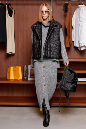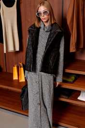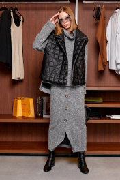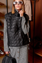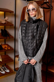 Жилет на стёганном синтепоне чёрного цвета из непромокаемой плащевки. Воротник- стойка, застёжка глубокая до верху на потайные кнопки, по бокам накладные карманы. Длина: 63 см; ОГ: 106-110-114 см (размер 44-46-48);