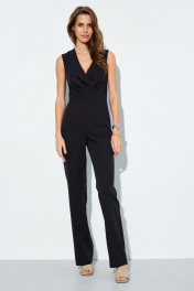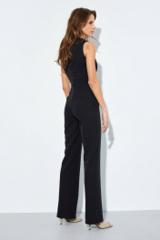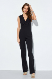 Комбинезон прилегающего силуэта из гладкой костюмной ткани. Лиф на подкладке. На передних деталях выполнены складки в области талии. Пояс притачной. Застежка в среднем шве спинки на потайную тесьму-молнию. Длина лифа по спинке до пояса 40,5 см. Длина брюк по боковому шву с учетом пояса 119 см. Длина брюк по шаговому шву 85 см.