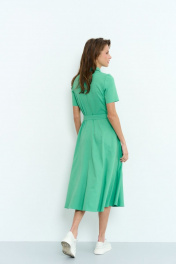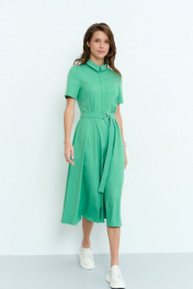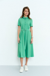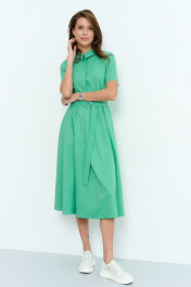 Платье полуприлегающего силуэта с коротким рукавом из легкой ткани без подкладки. Изделие отрезное по линии талии. По переду обработана планка с застежкой на петли и пуговицы. Воротник рубашечного типа на стойке. В боковых швах обработаны карманы. Длина изделия 118,5 см. Длина рукава 24 см,