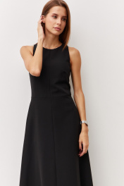 Платье прилегающего силуэта, отрезное по линии талии с юбкой А-силуэта. Изделие выполнено из гладкой плательной ткани на подкладке. В боковых швах обработаны карманы. Застежка в среднем шве спинки на потайную молнию. Длина изделия по среднему шву спинки 130 см.