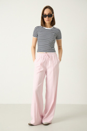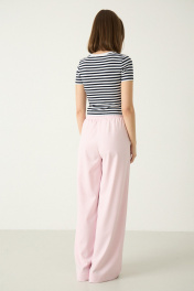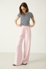 Широкие брюки из гладкой костюмной ткани с отстроченными стрелками по передним деталям. Пояс притачной с эластичной тесьмой и шнурком. В боковых швах обработаны наклонные карманы. Длина изделия по боковому шву 111 см. Длина изделия по шаговому шву 82 см. На фото с жилет 3013.3