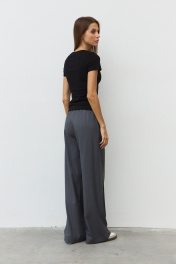 Широкие брюки из гладкой костюмной ткани с отстроченными стрелками по передним деталям. Пояс притачной с эластичной тесьмой и шнурком. В боковых швах обработаны наклонные карманы. Длина изделия по боковому шву 111 см. Длина изделия по шаговому шву 82 см.