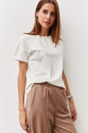 Брюки прямого кроя из гладкой костюмной ткани с отстроченными стрелками по передним деталям. Пояс притачной с эластичной тесьм. В боковых швах обработаны наклонные карманы. Длина изделия по боковому шву 108 см. Длина изделия по шаговому шву 79 см.