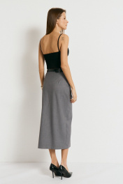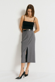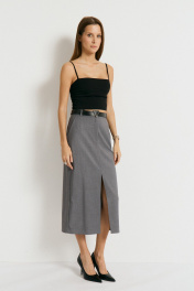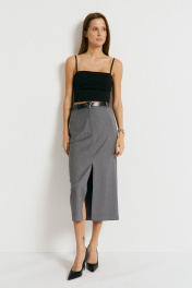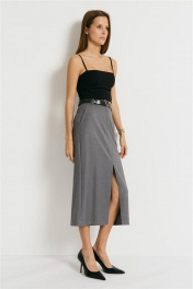 Юбка длиной ниже колена из костюмной гладкой ткани без подкладки с разрезом по переду . Изделие с вытачками на притачном поясе со шлевками. Застежка центральная на тесьму молнию и пуговицу. В боковых швах обработаны наклонные карманы. В размерах 48-52 частично вставлена резинка в области боковых швов . Ремень в комплект не входит. Длина изделия 92 см.