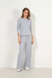 Трикотажный костюм из мягкой тонкой двухнитки состоящий из джемпера и брюк. Широкие брюки на притачном поясе с эластичной тесьмой и шнурком. В боковых швах обработаны наклонные карманы. Длина изделия по боковому шву 111 см. Длина изделия по шаговому шву 82 см. Джемпер прямого силуэта с круглой горловиной. Длина изделия 56 см. Длина рукава 59 см.