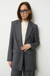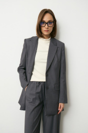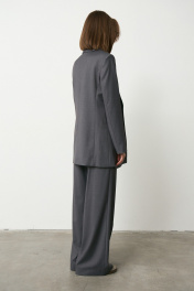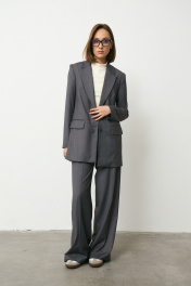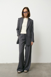 Жакет прямого силуэта, длиной до линии бедер с втачными рукавами до запястья, с воротником пиджачного типа. Застежка центральная на две прорезные петли и пуговицы. На деталях переда обработаны прорезные карманы в рамку с клапанами. На левой детали переда в области лацкана обработан прорезной карман-обманка с листочкой. Спинка с рельефами и средним швом. Изделие на подкладке. Длина изделия по спинки 77 см. Длина рукава 62 см. Брюки палаццо из гладкой костюмной ткани с отстроченными стрелками по передним деталям. Пояс притачной с эластичной тесьмой и шнурком. В боковых швах обработаны наклонные карманы. Длина изделия по боковому шву 111 см. Длина изделия по шаговому шву 82 см.