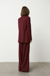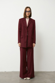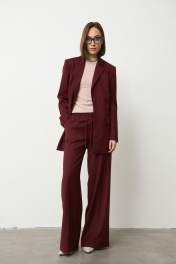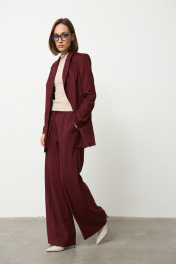 Жакет прямого силуэта, длиной до линии бедер с втачными рукавами до запястья, с воротником пиджачного типа. Застежка центральная на две прорезные петли и пуговицы. На деталях переда обработаны прорезные карманы в рамку с клапанами. На левой детали переда в области лацкана обработан прорезной карман-обманка с листочкой. Спинка с рельефами и средним швом. Изделие на подкладке. Длина изделия по спинки 77 см. Длина рукава 62 см. Брюки палаццо из гладкой костюмной ткани с отстроченными стрелками по передним деталям. Пояс притачной с эластичной тесьмой и шнурком. В боковых швах обработаны наклонные карманы. Длина изделия по боковому шву 111 см. Длина изделия по шаговому шву 82 см.