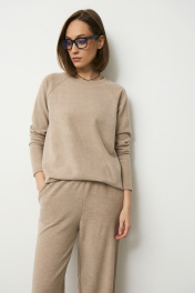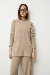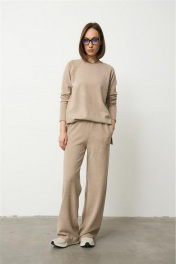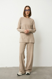 Теплый трикотажный костюм в рубчик состоящий из джемпера и брюк. Брюки прямого силэта на притачном поясе с резинкой. В боковых швах обработаны наклонные карманы. Длина изделия по боковому шву 108 см. Длина изделия по шаговому шву 80 см. Джемпер прямого силуэта с круглой горловиной и рукавами - реглан. В боковых швах разрезы. Спинка длиннее переда на 2 см по боковому шву. Длина изделия по спинке 69 см. Длина рукава 71-73 см.