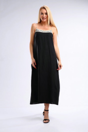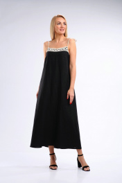Платье-сарафан из натуральной ткани белорусского производства. Крой А-силуэта расширенный к низу с карманами в боковых швах. Высоту посадки платья можно регулировать универсальными бретелями. По переду и спинке вставка из хлопкового кружева.длина сарафана- 110 см.
