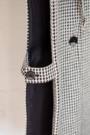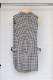 Жилет свободного кроя с центральной застёжкой на одну петлю и пуговицу.Воротник пиджачного типа с лацканами.Вместо бокового шва хлястики на петлю и пуговицу.