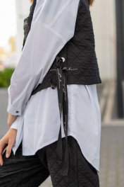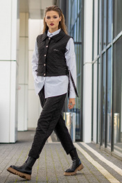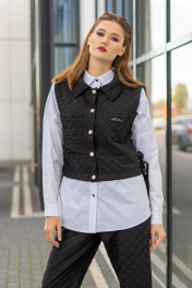 Комплект женский (жилет и рубашка). Жилет прямого силуэта актуального кроя на кнопках с накладными карманами, отложным воротником, декоративными кнопками и лентами по бокам. Рубашка прямого силуэта с фигурным низом, застёжкой на кнопки, по переду и спинке-кокетки.